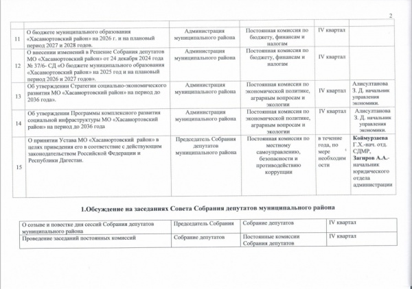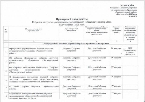 lПримерный план работы Собрания депутатов муниципального образования «Хасавюртовский район» седьмого созыва на 2025 года.